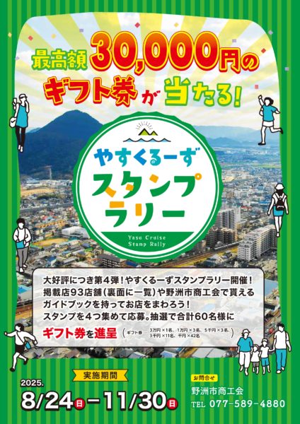 - スタンプを4種類集めた応募用紙は、実施期間中に野洲市商工会または参加店舗でお預かりして、応募を受け付けます。(※一人あたりの応募制限は無し)
